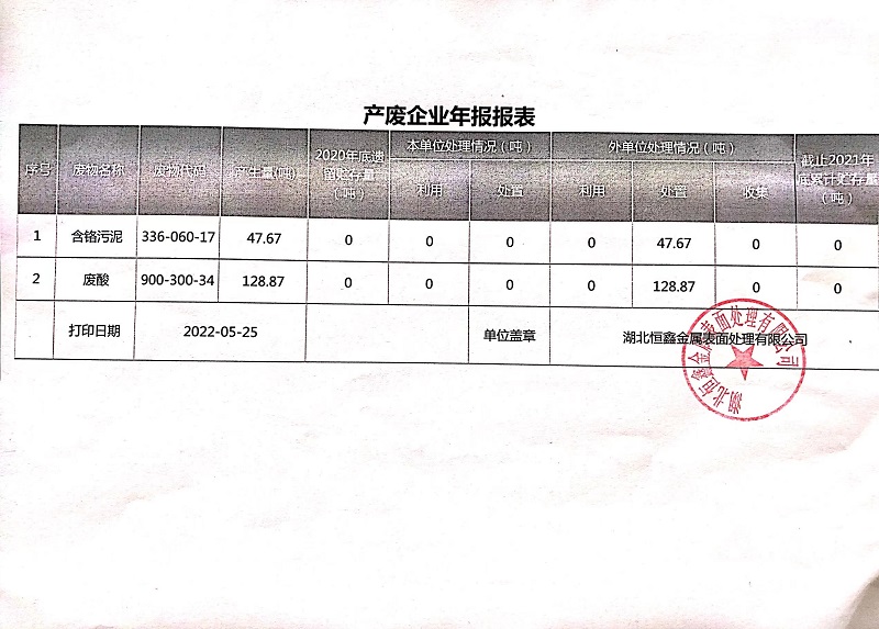 恒鑫公司2021年度危險(xiǎn)廢物信息公示