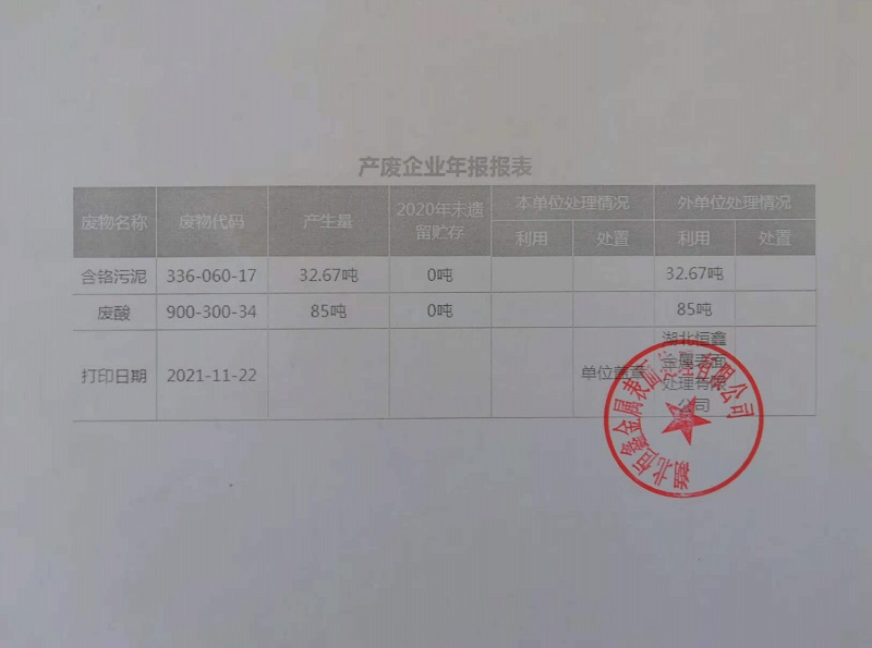 恒鑫公司2020年度危險(xiǎn)廢物信息公示