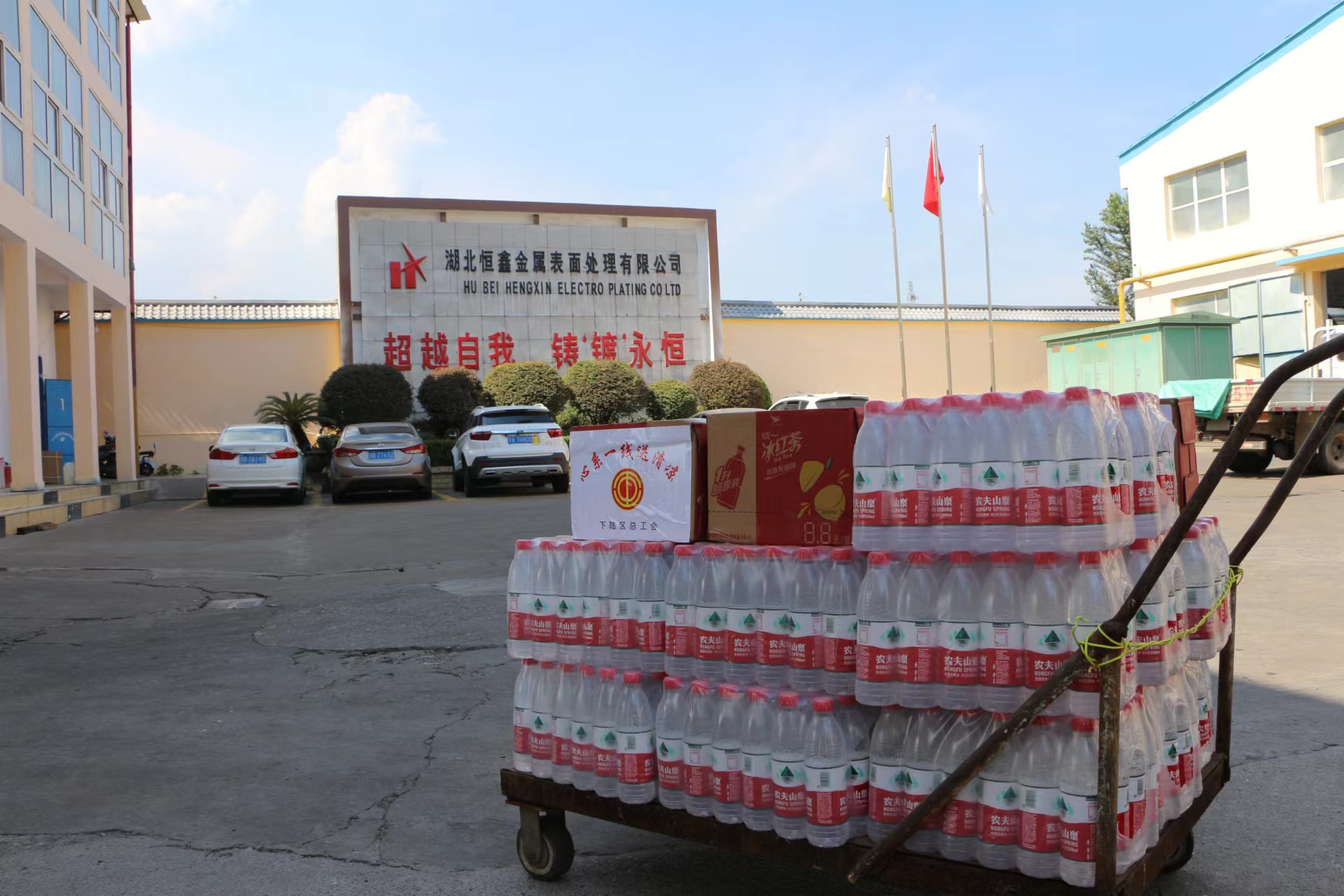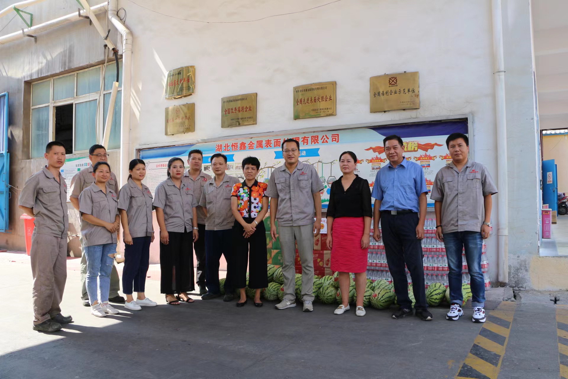 8月9日下午,下陸區總工會常務副主席徐新榮、副主席郭紅梅、盧仁才主任等領導同志頂著炎炎烈日,帶著降暑降溫物資來到湖北恒鑫金屬表面處理有限公司,向堅守在一線的員工表示親切慰問,并叮囑:高溫期間,堅持在崗位的職工,在保障安全生產的同時要加強自我安全保護意識,要做到勞逸結合,預防中暑,注意飲食衛生和休息,同時企業也要積極開展防暑降溫工作,有效預防高溫中暑和各類事故的發生。
