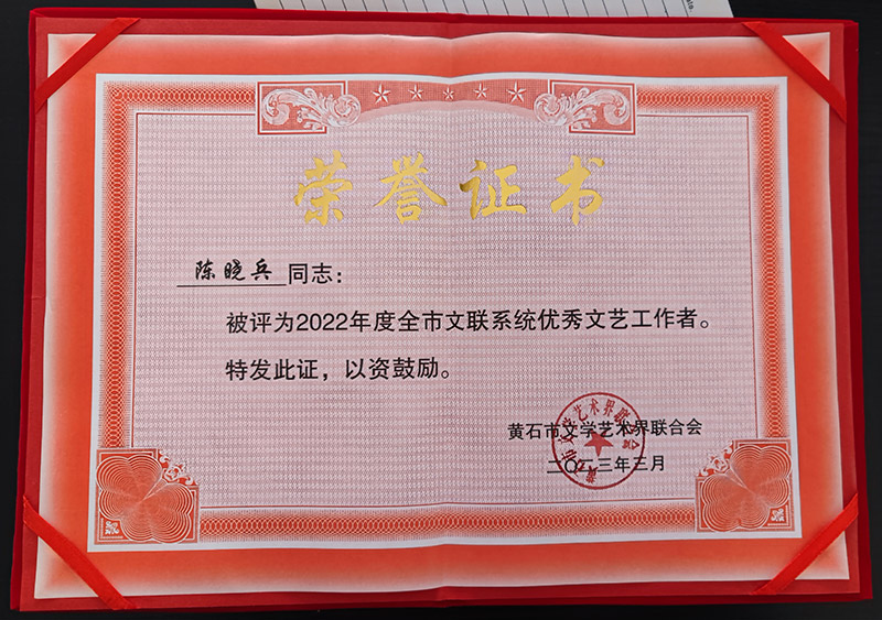 2023年3月18日上午,黃石市文聯五屆八次全委會會議在市群藝館召開,會上對2022年度全市文聯系統“先進單位”“優秀文藝工作者”“優秀文藝志愿者”進行了表揚通報。其中2023年度“先進單位10個”,“優秀文藝工作者”30名,“優秀文藝志愿者”70名。恒鑫公司董事長、下陸區文聯副主席、下陸區攝協主席陳曉兵被黃石市文學藝術界聯合會評為“2022年度全市文聯系統優秀文藝工作者”。